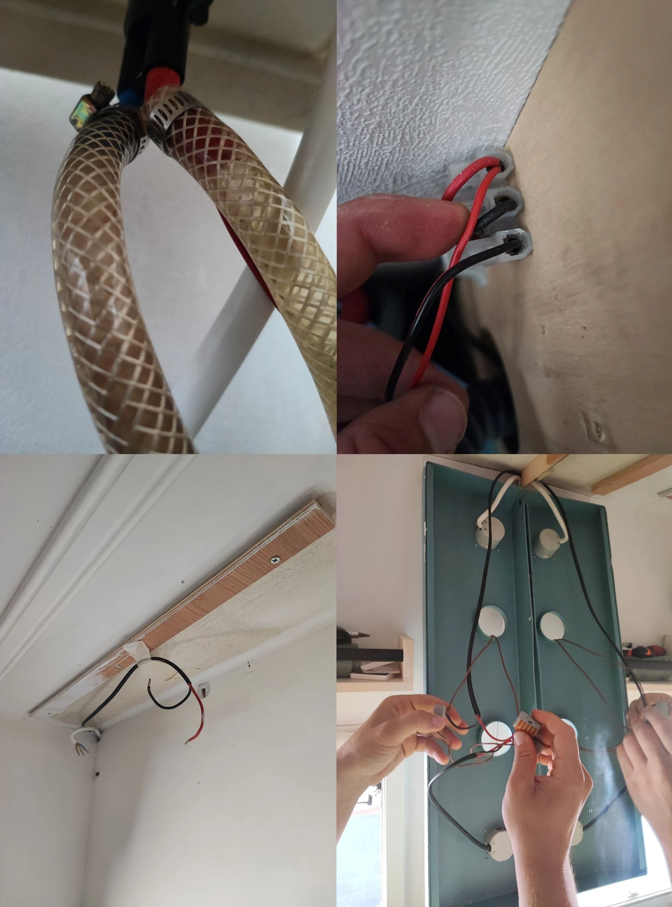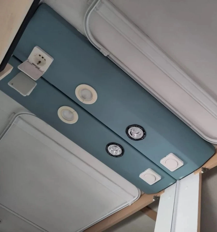 Die Lichtleiste an der Decke wurde demontiert, aber wir haben vorher Fotos gemacht, um sicherzustellen, dass wir die Spots später korrekt anschließen können. Alle Plastikteile, einschließlich auch des Unterschranks, der Lichtleiste und der Seitenabdeckung, wurden zuerst mit Plastikprimer grundiert. Anschließend habe ich Sprühlack in Weiß verwendet und mit Klarlack, ebenfalls von Action, versiegelt. Auch hier habe ich nach Gefühl und Deckkraft mehrmals lackiert. Wir ersetzten die alten Spots und Steckdosen durch neue in schwarzem Design. Die Steckdose und der Lichtschalter stammen aus der Berker Serie Integro und wurden einfach auf Amazon in schwarz nachgekauft, um sie direkt in die vorhandenen Löcher zu setzen. Beim Kauf der Spots haben wir darauf geachtet, dass der Durchmesser passt und sie für 12V geeignet sind. Da haben wir ein richtiges Schnäppchen erwischt, 6 Stück Einbauspots für nur 13€, leider sind die aber nicht mehr erhältlich, also verlinke ich euch eine Alternative.