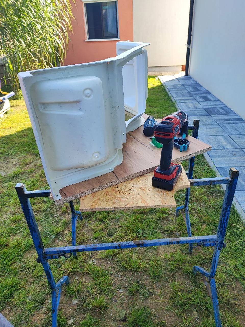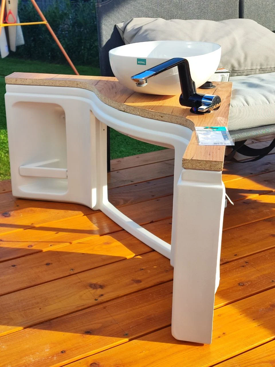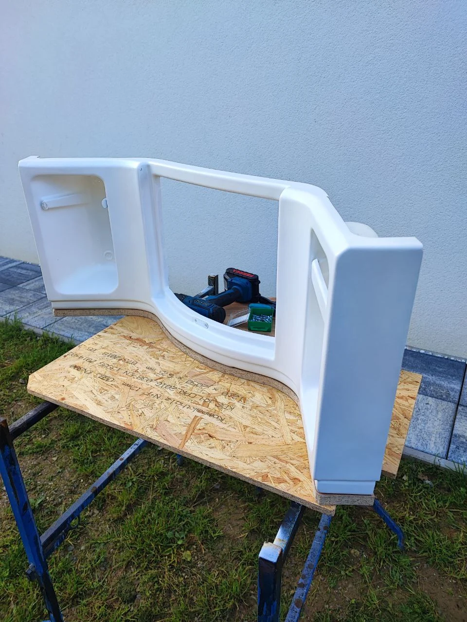 Das Original-Waschbecken war stark von der Sonne vergilbt, stark verschmutzt und kaum mehr zu reinigen. Trotz vieler Versuche es wieder ansehnlich zu machen, musste es weichen. Das alte Waschbecken diente uns als Vorlage zum Nachzeichnen für die Arbeitsplatte.