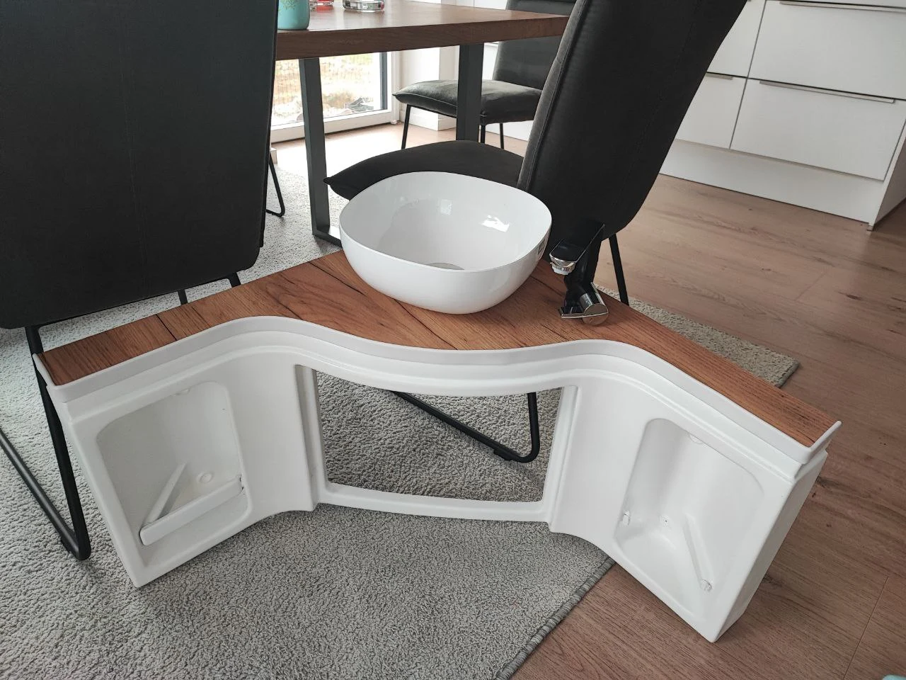 Das Waschbecken wurde vom Unterschrank gelöst, um Platz für unsere neue Arbeitsplatte zu schaffen. Das alte Waschbecken diente uns als Vorlage. Wir haben eine Spanplatte in Eiche-Optik im Baumarkt bestellt und zu Hause mit einer Stichsäge zugeschnitten. Dann haben wir die neue Arbeitsplatte auf den bestehenden Unterschrank geschraubt und Löcher für den Spülenablauf und die neue Armatur (Comet Arona) gebohrt. Hier sollte man aber vorher genauestens überlegen, wie man Waschbecken und Armatur platziert, denn es könnte z.B. eine Rolloschiene im Wohnwagen störend sein.