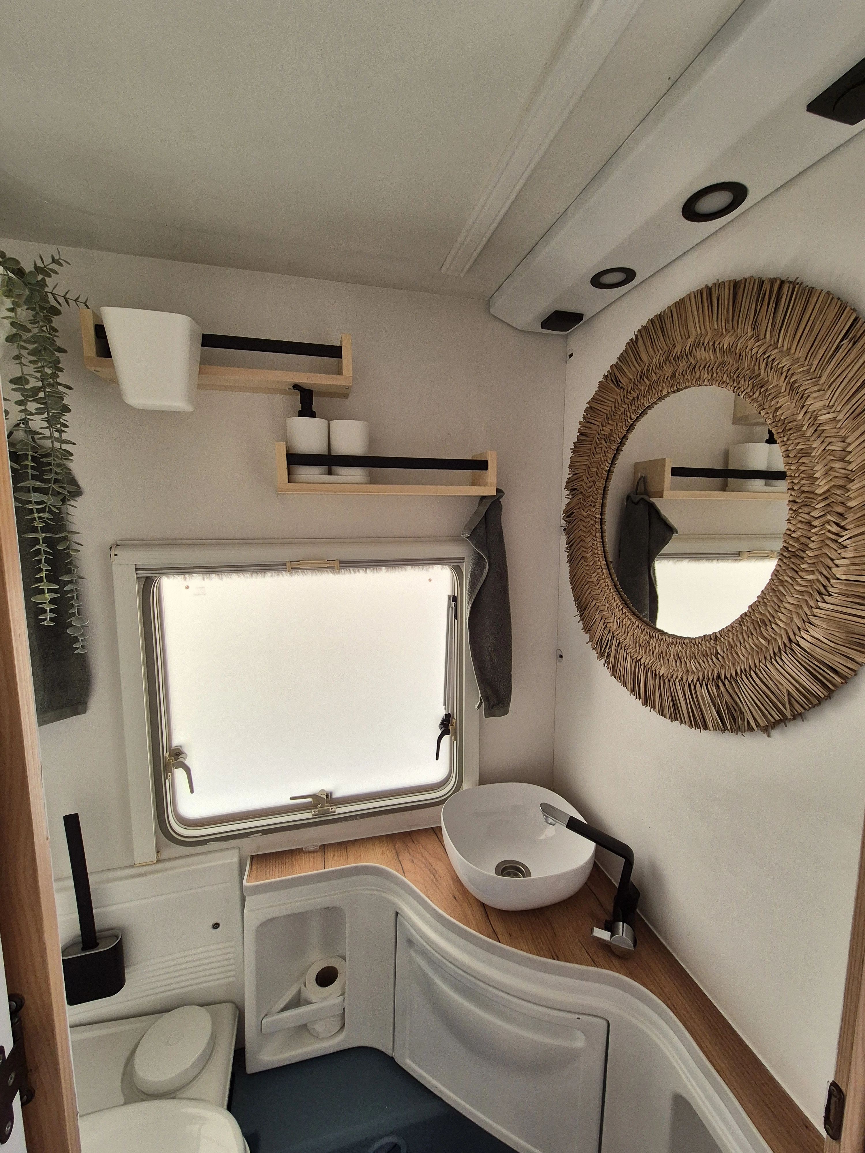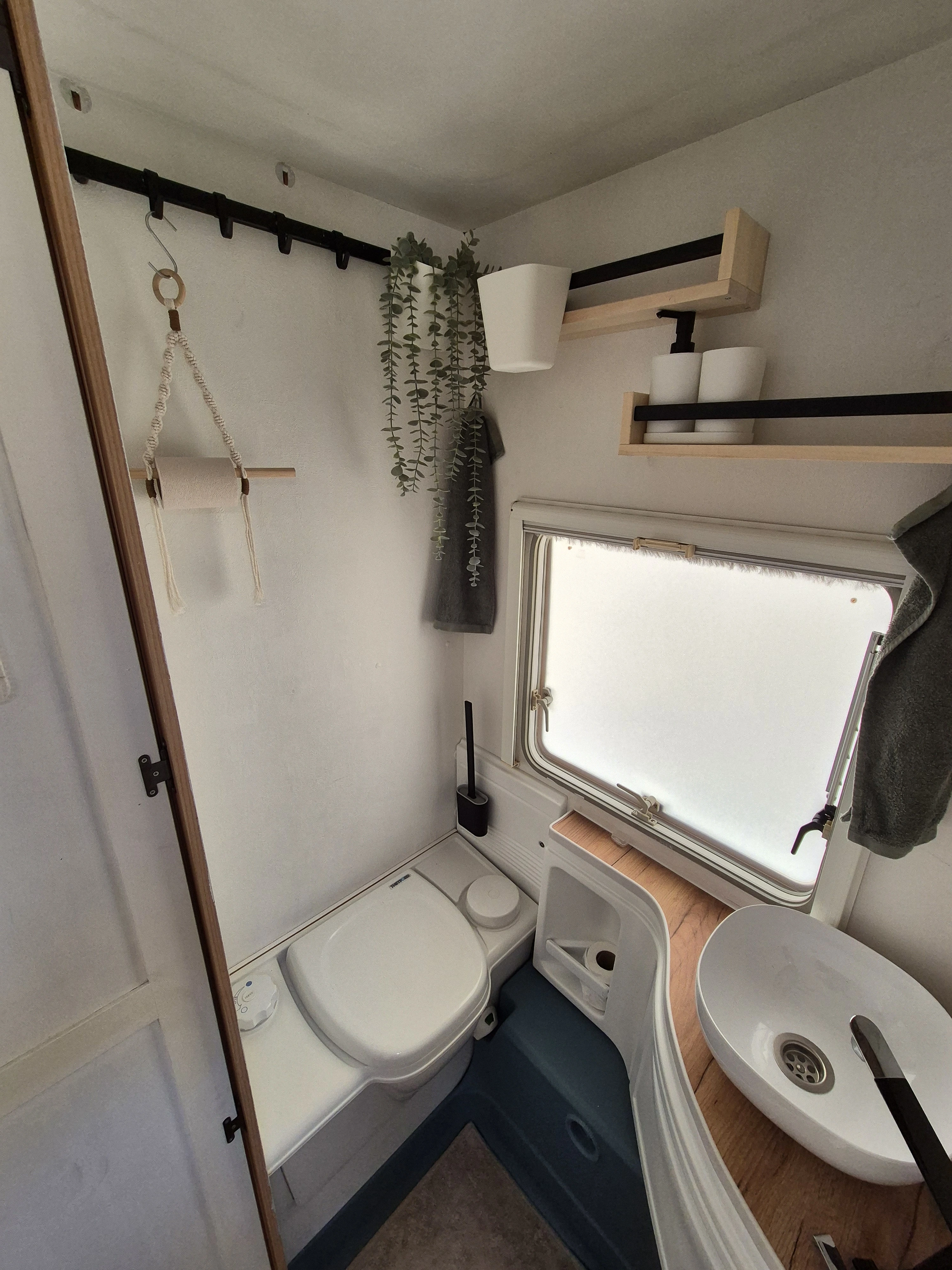 Fazit: Unsere Wohnwagen-Badezimmer-Renovierung war manchmal eine Herausforderung, aber das Ergebnis hat sich definitiv gelohnt. Mit Kreativität und handwerklichem Geschick haben wir unseren kleinen Raum in ein stilvolles und funktionales Badezimmer verwandelt. Ich hoffe, dass diese Schritte dich bei deinem eigenen Renovierungsprojekt inspirieren können! Nur das Schneiden des Melamin-Waschbeckens war etwas knifflig - hier hätten wir wahrscheinlich ein spezielles Werkzeug gebraucht. Aber insgesamt bin ich mit unserem neuen, frischen und hellen Badezimmer sehr zufrieden.