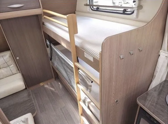 Direkt daneben liegt das Stockbett mit zwei Schlafplätzen. Die Kinder haben dadurch klare, eigene Schlafbereiche, was im Campingalltag für viel Struktur und Ruhe sorgt.