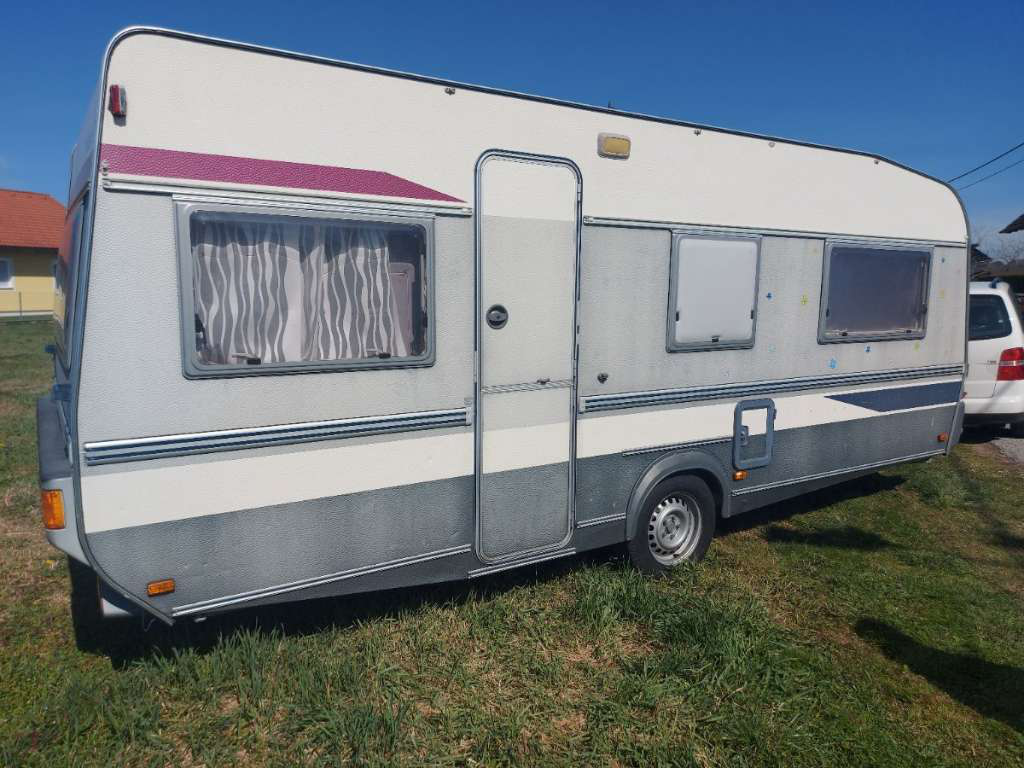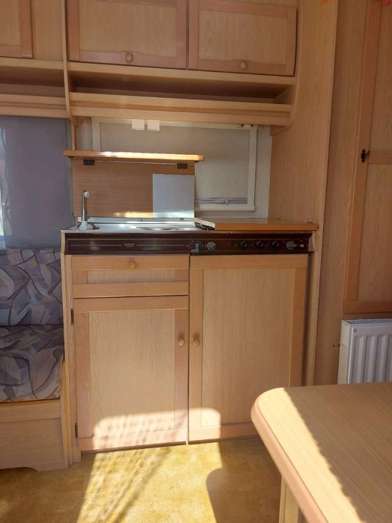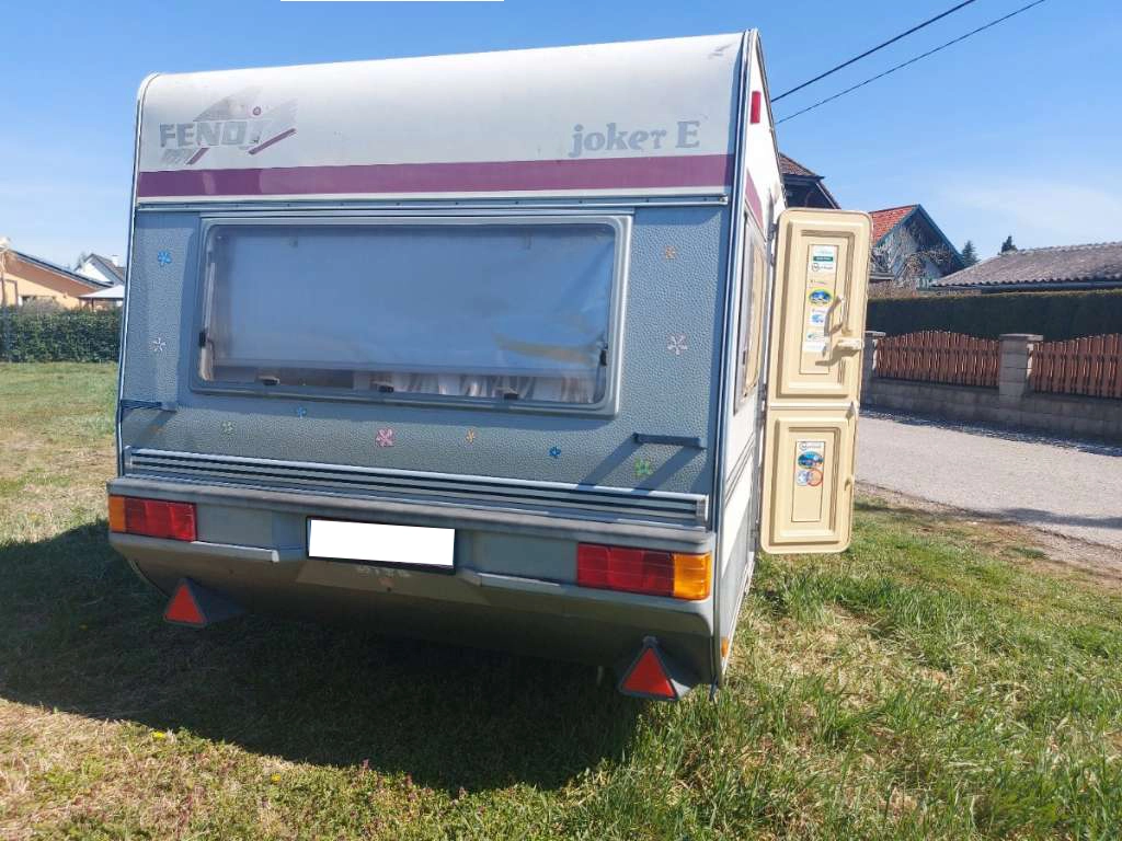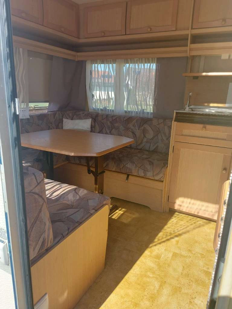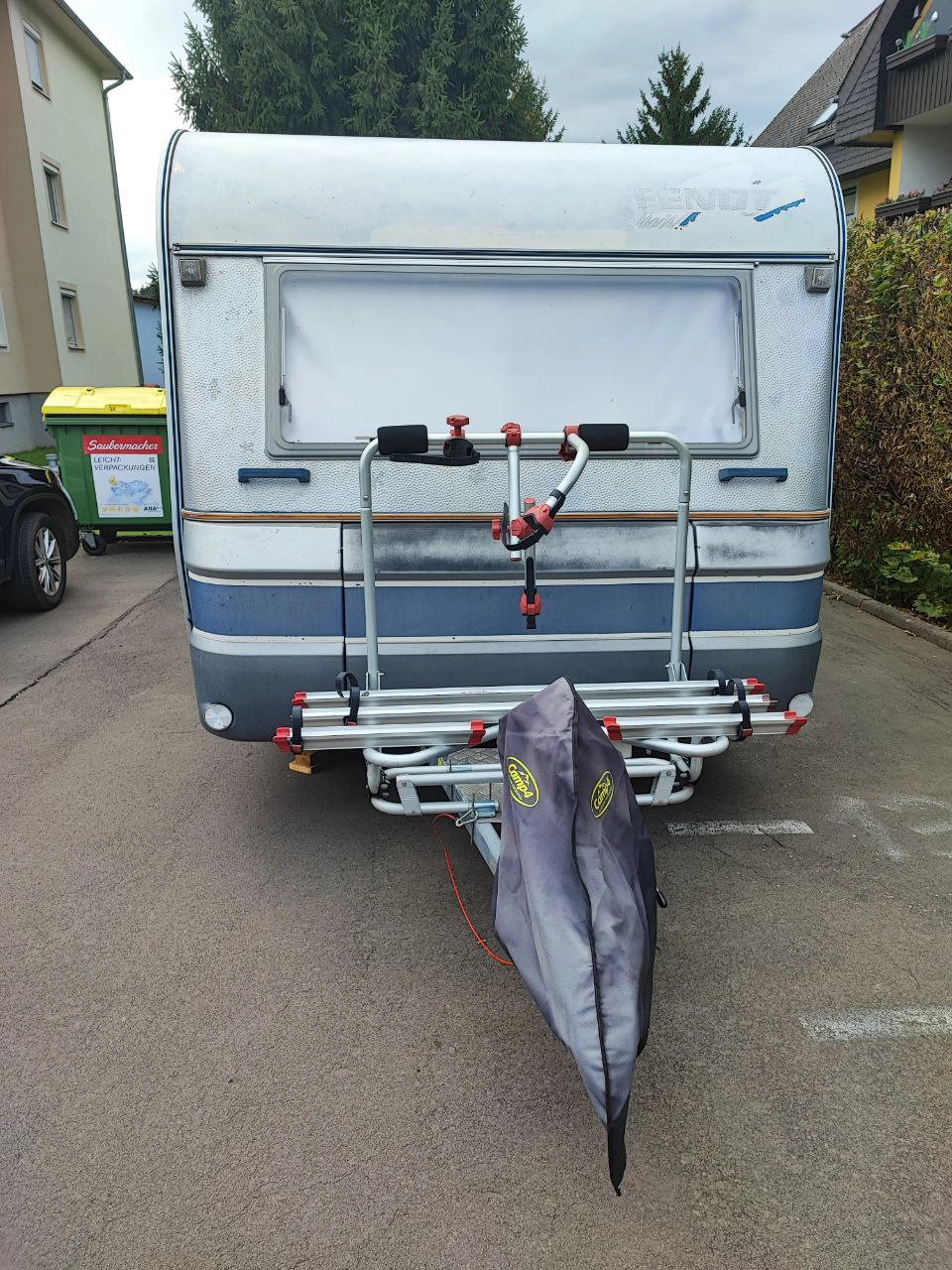 - Ausstattung: Deichsel-Fahrradträger für 3 Fahrräder, Sonnendach (kein vollwertiges Vorzelt), kleines Wintervorzelt, Elektroheizung (kein Gas mehr im Wohnwagen)